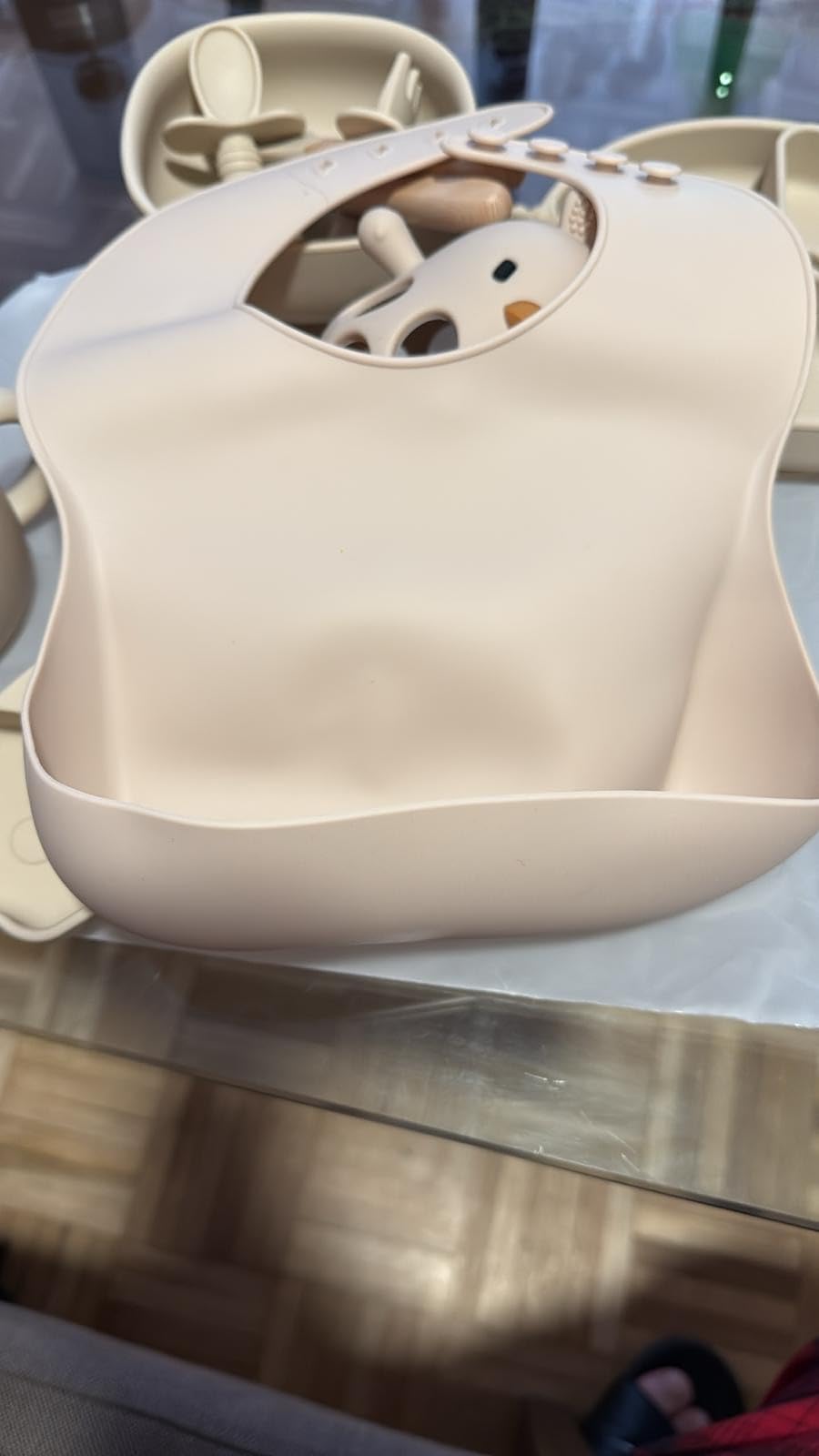 "Excelente calidad. Los cubiertos son perfectos para las manos pequeñas de mi hijo y el babero con bolsillo atrapa toda la comida que cae. Se limpia súper fácil y es apto para el lavavajillas. ¡Una gran compra!"