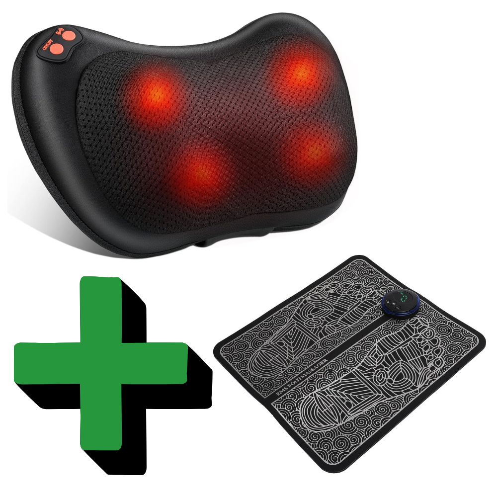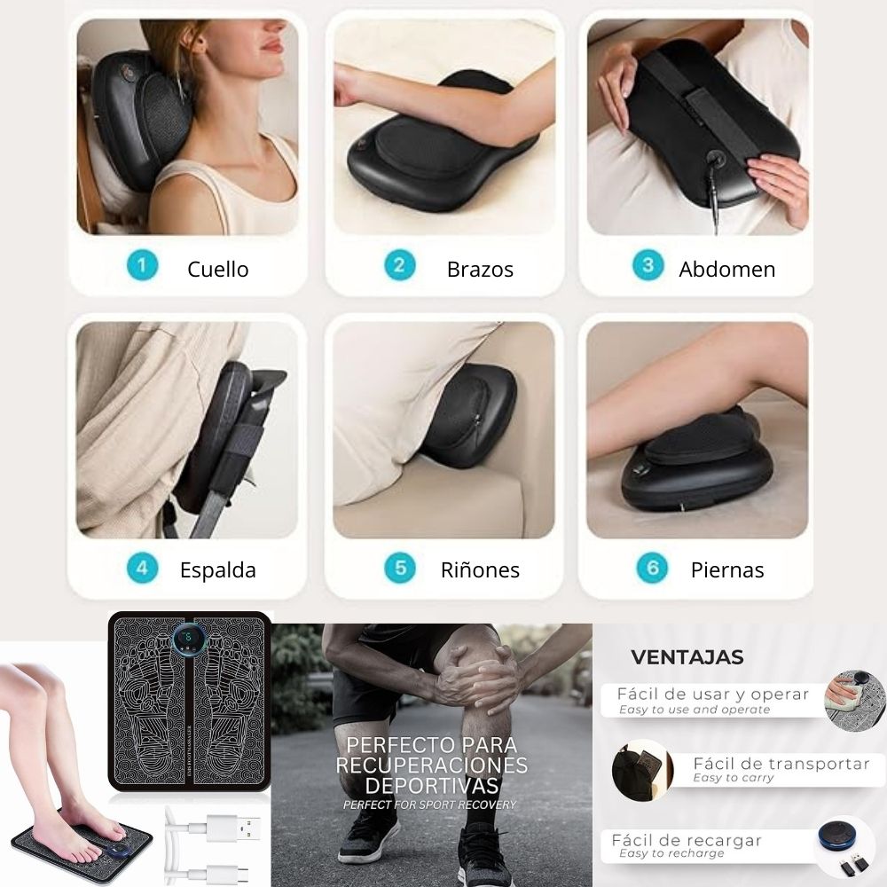Este pack completo de masajeadores combina un masajeador cervical y de espalda con un masajeador eléctrico de pies, ofreciéndote una experiencia de relajación total cada día.